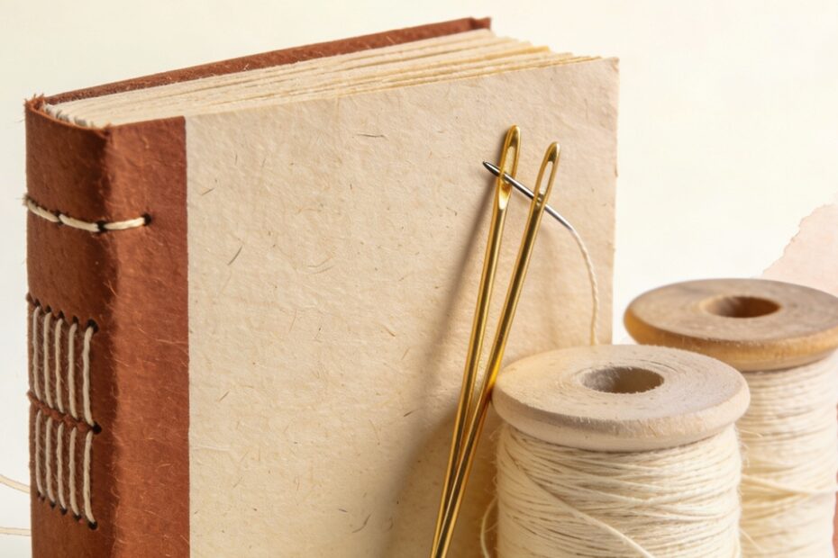 A qualidade do material define boa parte do resultado. Papel de fibras longas, linha de linho encerada, agulha adequada e suporte de costura estável melhoram a execução e aumentam a vida útil da peça.